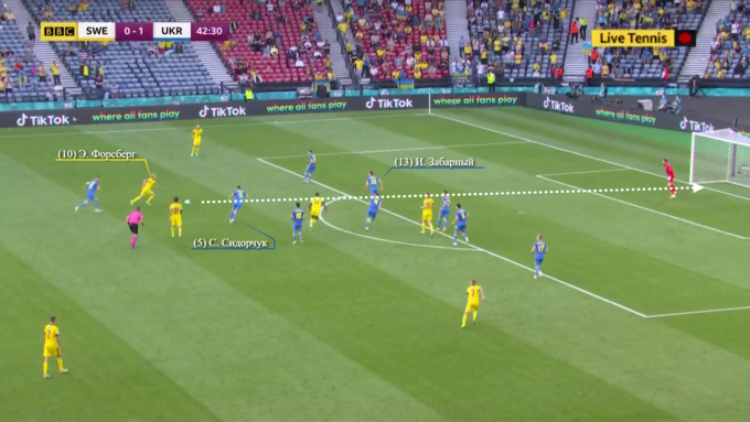 Но на 43-й минуте попытка пробить из-за пределов штрафной принесла Швеции успех. Кажется, что Сидорчук не доиграл до конца против Форсберга, вследствие чего перед тем образовалась свободная зона, которую вингер и решил использовать для нанесения удара. Мяч, срикошетив от Забарного, пролетел мимо оказавшегося беспомощным в этой ситуации Бущана – 1:1. Очевидно, что винить кипера, равно как и 18-летнего центрбека в этом мяче вряд ли стоит. Первыйне мог среагировать на такой рикошет, а второй, кажется, внимательно соблюдал линию обороны в попытке создать потенциальный офсайд для соперника, если бы Форсберг решился на попытку отдать проникающую передачу.