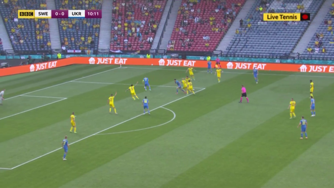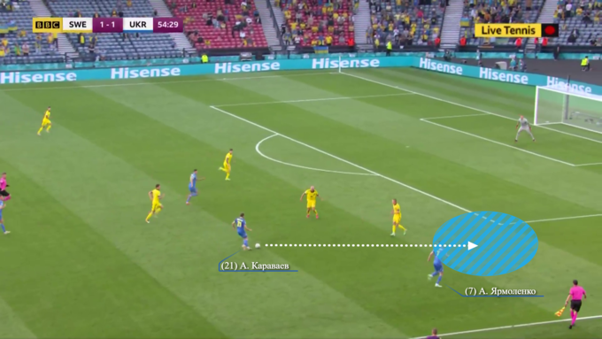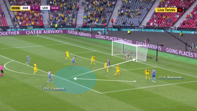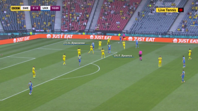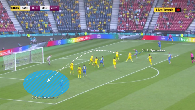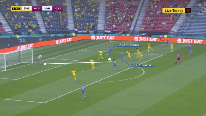Впрочем, в обороне Швеция продолжала действовать крайне строго. Уже на 11-й минуте Украина получила первый шанс забить, когда Ярмоленко и Яремчук, сместившись в зону правого полуфланга, обыгрались друг с другом. Здесь стоит обратить внимание на то, как сыграли защитники шведов – сразу шесть игроков грамотно выстроились в линию, подлавливая Ярмоленко на офсайде. Выполняя этот маневр, беки Швеции даже подзабыли о Яремчуке, который и получил несколько метров свободного пространства.