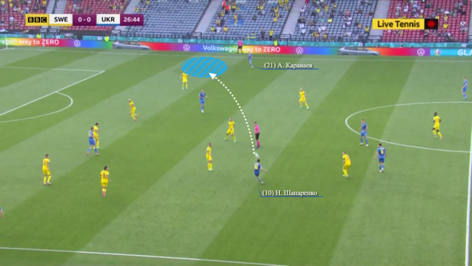 Что правда, нашим достаточно быстро удалось перестроиться. Футболисты сборной Украины поняли, что свободные зоны в обороне Швеции – это вовсе не миф, и они реально существуют. Первым, кто попытался использовать это с пользой для «сине-желтых» оказался Шапаренко. Хавбек, который провел очередной впечатляющий с точки зрения работы с мячом и качества передач (из 34 пасов Николая все оказались точными!) матч, увидел забегание по правому флангу со стороны Караваева, и выдал точнейший заброс на партнера в зону.